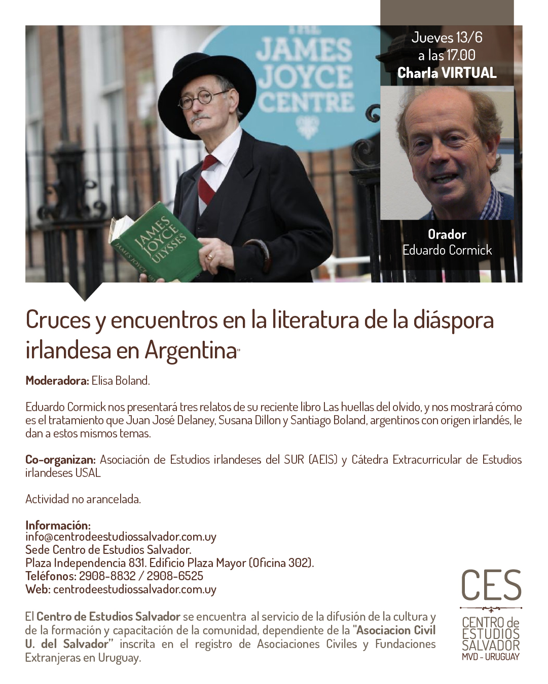 Eduardo Cormick nos presentará tres relatos de su reciente libro Las huellas del olvido, y nos mostrará cómo es el tratamiento que Juan José Delaney, Susana Dillon y Santiago Boland, argentinos con origen irlandés, le dan a estos mismos temas.